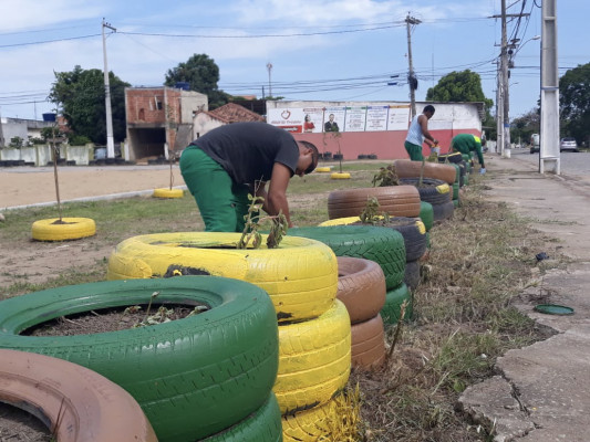 A secretaria Municipal de Desenvolvimento Ambiental (SMDA), segue com a revitalização do terreno com cerca de 4 mil m², no bairro Jóquei Clube, que será transformado em um espaço sustentável. Nesta segunda-feira (30), diversos serviços estão realizados pela equipe, como pintura nos pneus que receberam plantas ornamentais, plantação de mudas de árvores frutíferas e nativas, além da colocação de raspas de asfalto e brita para o nivelamento do solo.