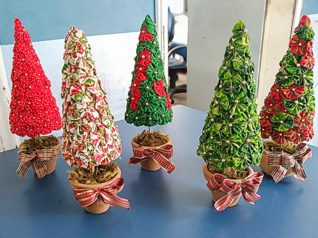 No total, sete mulheres, entre pacientes e familiares de pacientes, fazem parte da oficina e atuam na confecção dos produtos. Mais de 40 árvores de Natal feitas com fuxico já foram encomendadas e estão em fase de produção.
