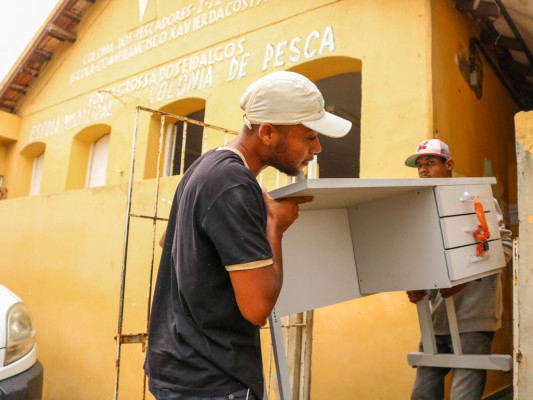 Entre os materiais recebidos estão: geladeira, mesa, cadeira, marca, arquivos e longarinas.