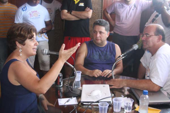 A prefeita Rosinha Garotinho, acompanhada do marido, o deputado federal Anthony Garotinho, esteve neste sábado (5) no estande da secretaria de Meio Ambiente, na Praia do Farol de São Tomé, onde participou do programa Entrevista Coletiva, da Rádio Diário FM. Na oportunidade, a prefeita anunciou a liberação, pela Secretaria Nacional de Portos da verba de R$ 65 milhões, para a conclusão das obras do Complexo Logístico Farol-Barra do Furado, e de R$ 15 milhões, pelo Ministério da Saúde, para ampliação da capacidade do Hemocentro do Hospital Ferreira Machado. A prefeita também anunciou a disponibilização da vacina contra a Hepatite A, pela rede municipal.