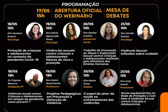 Serão 08 palestras com autoridades da área de promoção dos direitos da criança e do adolescente, transmitidas pelo YouTube, no canal do PAE (Programa de Aprendizagem Eficiente). Estarão participando a médica Marta Alvez; o delegado da Polícia Federal, Clayton Bezerra; a assistente social Denise Avelino; as psicólogas Joviana Avanci, Maria Aparecida Alvez, Jamile Santos e Maíra Nascimento, e a promotora Anik Assed.