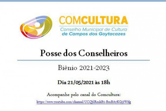 A cerimônia de posse dos conselheiros do Conselho Municipal de Cultura de Campos dos Goytacazes (Comcultura), mandato de 2021 a 2023, será realizada nesta sexta-feira (21), às 18h, com transmissão pelo canal “Comcultura”, no YouTube. A presidência será do poder público nos próximos 12 meses, assumida pela presidente da FCJOL, Auxiliadora Freitas, alternando a presidência anterior que era da sociedade civil.
