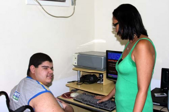 O aluno do 2º ano do ensino fundamental, Vinicius de Souza Viana, 18 anos, portador de encefalopatia, recebe um tratamento particular, com equipamentos e programas para deficientes visuais, leitores de tela, teclado e mouse adaptados para acesso ao computador, estimulando a alfabetização e o desenvolvimento psicomotor.