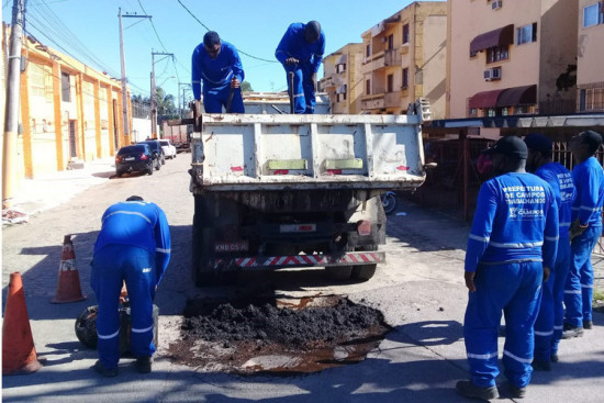 Equipes da Secretaria de Obras e Infraestrutura adiantam os recortes dos trechos danificados para, assim que a base estiver seca, realizar a recapagem asfáltica, nivelada com a pista por um dos rolos compressores