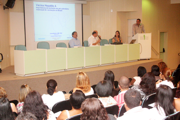 O vice-prefeito de Campos, Francisco Artur de Souza Oliveira; o secretário municipal de Saúde, Paulo Hirano; o superintendente de Saúde Coletiva da Secretaria, Charbell Kury participaram na quarta-feira (16), à noite, junto com a pediatra doutora em Medicina pela Universidade de São Paulo (USP) e diretora de saúde pública da empresa Sanofi Pasteur, Lúcia Ferro Bricks, da sessão médica de informação aos profissionais de saúde sobre o lançamento da vacina contra a Hepatite A que acontece no próximo dia 26 no Centro de Saúde de Guarus Dr Henrique Oliveira, próximo ao 56º Batalhão de Infantaria, com a presença do Ministro da Saúde, Alexandre Padilha.