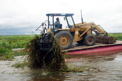 Nesta segunda (21), duas balsas, com duas retro escavadeiras instaladas, soltam a grande quantidade de vegetação que formou uma verdadeira barreira na foz, represando as águas na Região do Imbé e no distrito de Ururaí e impedindo a vazão dessas águas para a Lagoa Feia e, de lá, para o Canal das Flechas e o mar.
