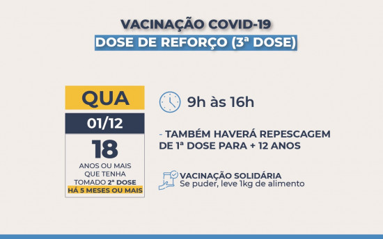 Devem tomar a primeira dose as pessoas com idade acima de 12 anos que, por algum motivo, ainda não se vacinaram. Para receber a vacina é preciso apresentar documento com foto, CPF e comprovante de residência.