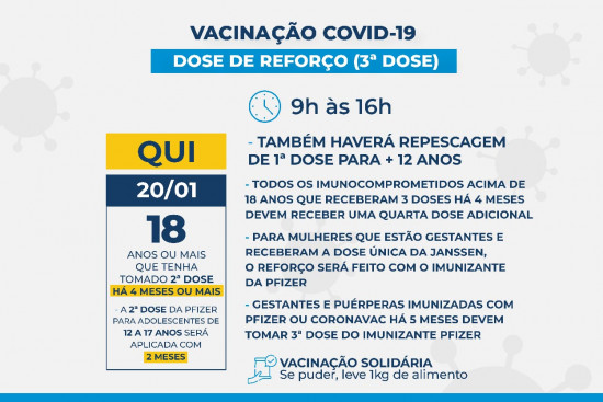 As pessoas com idade igual ou superior aos 18 anos que tenham recebido a segunda dose há quatro meses, independente do imunizante, já podem tomar a dose de reforço. Adolescentes não estão inclusos nesse reforço. Já gestantes e puérperas (45 dias após o parto) imunizadas com Pfizer ou CoronaVac, a terceira dose deve ser feita com o intervalo de cinco meses. O imunizante usado será o da Pfizer. Além dos documentos pessoais, deve-se apresentar o cartão pré-natal.