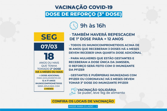 A terceira dose será aplicada para as pessoas com idade igual ou superior aos 18 anos que tenham recebido a segunda dose há quatro meses, independente do imunizante. As gestantes e puérperas (45 dias após o parto) imunizadas com Pfizer ou CoronaVac, a terceira dose deve ser feita com o intervalo de cinco meses. O imunizante usado será o da Pfizer. Adolescentes ainda não estão inclusos nesse reforço e devem aguardar a convocação.