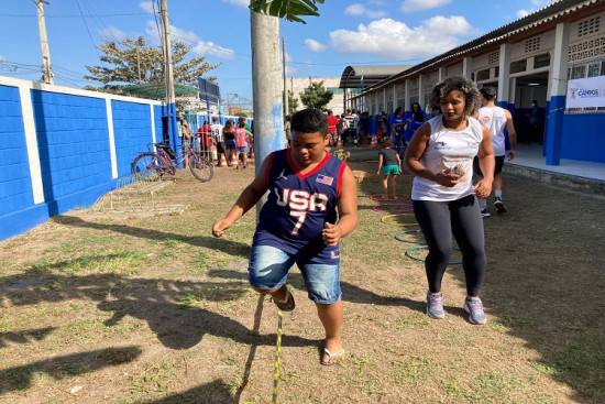 Crianças praticam atividades esportivas no Prefeitura em Ação em Ururaí