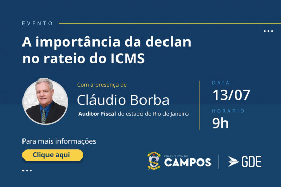 A Prefeitura de Campos, por meio da Secretaria de Fazenda, realiza no próximo dia 13, às 9h30, no auditório do Centro Administrativo José Alves de Azevedo (CAJAA), sede da prefeitura, o evento “A importância da Declan no rateio do ICMS”. Vários temas relacionados à Declaração Anual para o Índice de Participação dos Municípios serão abordados. O evento é destinado a empresários e contadores das empresas optantes pelo regime normal de tributação e, para confirmar presença, basta clicar (