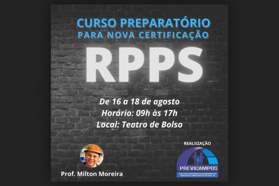 AQUI) para o curso preparatório sobre a Nova Certificação do Regime Próprio de Previdência Social (RPPS), voltado para servidores públicos e membros da diretoria da entidade e integrantes dos conselhos fiscal e deliberativo. O curso é gratuito e será realizado entre os dias 16 e 18 de agosto, no Teatro de Bolso Procópio Ferreira, Centro. O presidente do PreviCampos, Mário Filho, informa que o curso é fundamental e visa fornecer aos participantes nova certificação RPPS, prevista no Artigo 8B da Lei 9.717/1998.