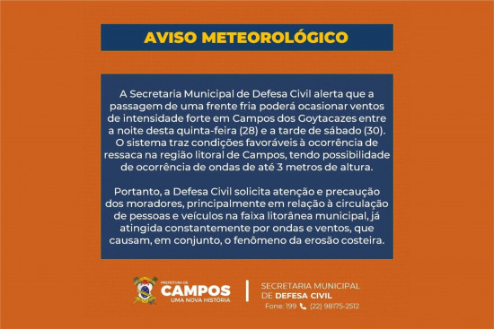 Secretaria de Defesa Civil alerta para previsão de frente fria e ressaca