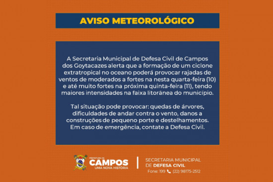 Secretaria de Defesa Civil alerta para formação de ciclone extratropical