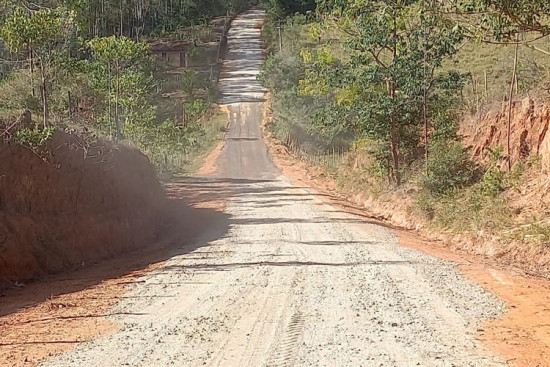No momento está sendo concluída a construção da camada de bica corrida sobre a Estrada do Calombê e fazendo a compactação final no último trecho da Estrada da Conquista, com uso do rolo compressor