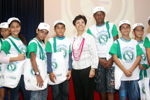 A Prefeitura de Campos deu mais um passo decisivo nos trabalhos de prevenção e combate à dengue. Cerca de 200 alunos, de 40 escolas municipais, receberam um kit de identificação social para atuarem como agentes mirins no Projeto Todos Contra a Dengue. O evento, para entrega das camisas, bonés e bolsas, aconteceu na manhã desta quinta-feira (18) no Instituto Federal Fluminense (IFF). Participaram do evento a secretária de Educação, Joilza Rangel Abreu, equipes da secretaria e das unidades escolares, além de pais dos alunos.