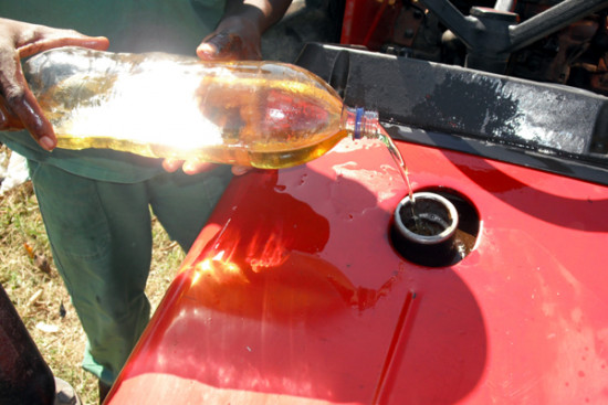 Enquanto o óleo, resultante da produção de 0,5 hectare do girassol no ano passado, não é processado, biodiesel derivado de óleo doméstico saturado está sendo testado em tratores da secretaria municipal de Agricultura e Pesca. O teste, que visa avaliar a eficiência do combustível no motor movido a diesel, teve início na manhã desta segunda-feira (06). “O objetivo é treinar profissionais para o manuseio da máquina de transesterificação e, também, verificar o desempenho dos veículos com o uso desse combustível feito a partir de óleo de fritura. Estando o processo dominado e confirmada a eficiência desse tipo de biodiesel, vamos iniciar o processamento do óleo de girassol”, explicou o secretário municipal de Agricultura e Pesca, Frederico Paes, acompanhado do engenheiro químico Luiz Paulo Vaillant, que está auxiliando no processo de transformação do óleo vegetal em biocombustível.