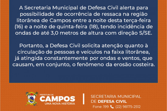 A Defesa Civil destaca atenção quanto à circulação de pessoas e veículos na faixa litorânea, já atingida constantemente por ondas e ventos, que causam, em conjunto, o fenômeno de erosão costeira
