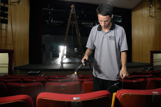 Equipamento recebeu higienização dos assentos da plateia. Processo de ignifugação dos tecidos que vestem a caixa cênica, prevenindo a propagação de chamas, também foi realizado