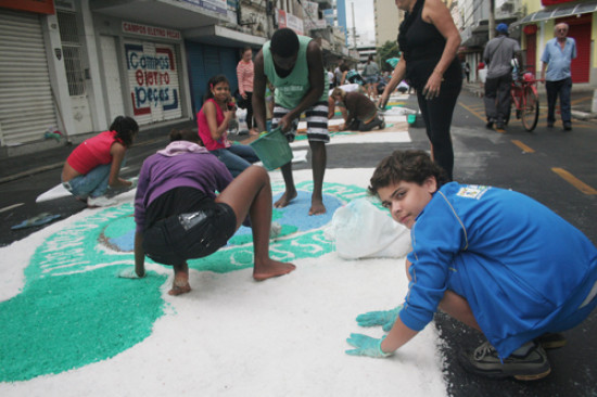 Alunos de 14 escolas municipais de Campos participaram da confecção de tapetes de Corpus Christi nesta quinta-feira (23). Os tapetes foram confeccionados dentro do tema da Campanha da Fraternidade 2011 que, este ano, é sobre Fraternidade e a Vida no Planeta - a criação geme em dores de parto. De acordo com o coordenador de ensino religioso da Secretaria Municipal de Educação (Smec), Carlos Magno da Silva Amâncio, a secretaria ficou responsável pela confecção de 15 tapetes, sendo um da secretaria e 14 das escolas. Ele acrescentou que serão incluídos desenhos dos três primeiros colocados do Concurso Municipal do Dia Mundial do Meio Ambiente: Água para Vida.