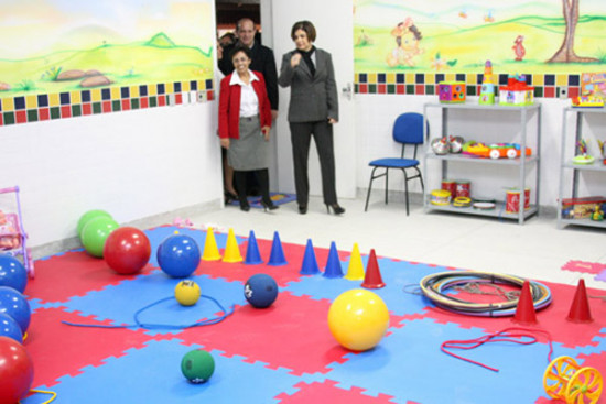 Sala do médico e outros itens - O público visitante cumprimentou a prefeita pelo padrão de materiais utilizados no refeitório, nos banheiros, na cozinha, na sala do médico, a biblioteca, que agrega a sala de contação de histórias, a brinquedoteca, com instrumentos lúdicos e TV de LCD, com vídeo e jogos educativos.