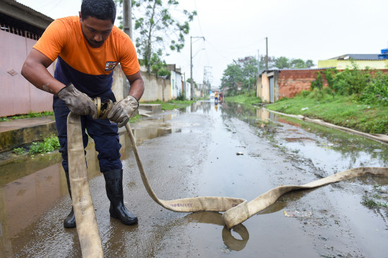 Na manhã desta segunda-feira (28), equipes da pasta realizaram bombeamento de acúmulo de água na Rua Projetada A, no Parque Novo Jóquei