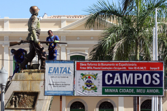 A prefeitura está reformando o Monumento ao Expedicionário na Praça do Santíssimo Salvador. A obra, que faz parte do projeto de Revitalização do Centro Histórico de Campos, tem previsão de entrega para a sexta-feira (05), véspera do feriado do Santíssimo Salvador, padroeiro da cidade. A inauguração vai fazer parte das comemorações da 359ª Festa do Santíssimo Salvador, que começa nesta sexta-feira (29) com a programação religiosa.