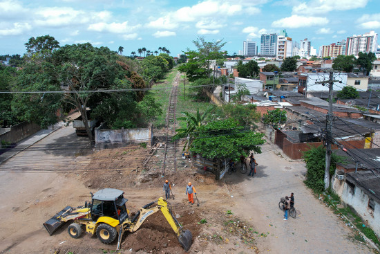 Homens e máquinas estão no local fazendo a abertura da rua que irá interligar os parques Rodoviário e São Caetano