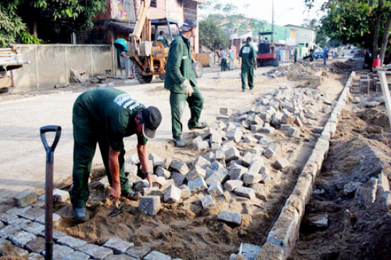 Operários vem trabalhando no calçamento da Rua 1, que vai ser elevado em relação ao nível antigo para acompanhar a nova galeria, de grandes proporções. Isso fez com que o nível do meio fio tivesse que ser corrigido, igualando o calçamento com o nível da galeria.