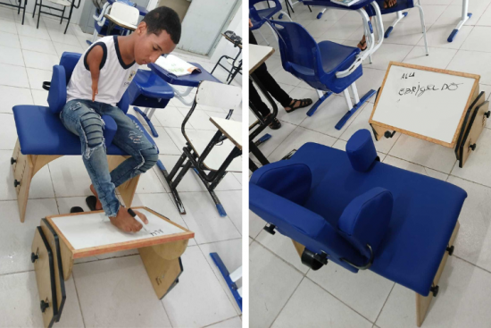 A cadeira tem inclinação de aproximadamente 45°, regulagem de altura, largura e profundidade do assento. Já a mesa tem os pés adaptados para as funções de alimentação e atividades escolares com regulagem na altura, inclinação média de 180° e sistema de deslize para as laterais. A avó de Alan, Vera da Silva Souza, contou que ele estava com dificuldades para estudar porque sentia dores nas costas por precisar escrever com os pés. Agora, está feliz com o equipamento.