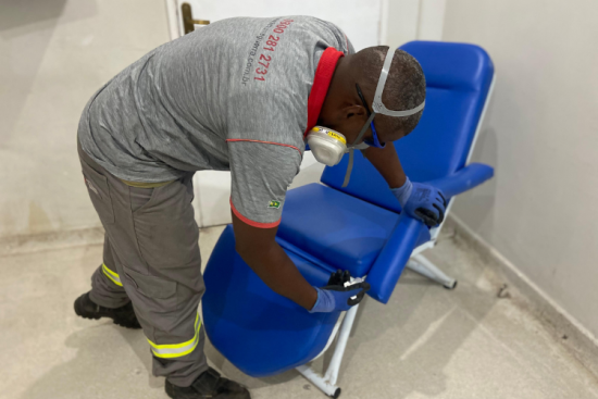 A ação incluiu a aplicação de produtos específicos em ralos, pias, banheiros, caixas de passagem de esgoto e cadeiras, com produtos em gel para áreas de contato frequente, como poltronas