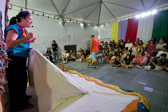Com uma mistura de contação de história e música, as crianças puderam interagir com os artistas Warley Goulart, Rosana Reategui e Manoel Gonçalves, do grupo "Tapetes Contadores de Histórias"