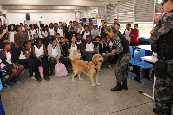 Após a palestra, o cão Zeus, do GOC, que também participa da 18ª edição do programa, no próximo sábado, fez seu show, encantando as crianças e adolescentes