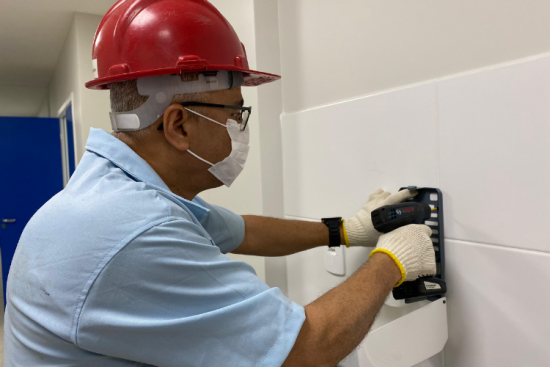 As obras de ampliação e modernização do novo pronto-socorro do Hospital Ferreira Machado (HFM) continuam em ritmo acelerado. Nessa quinta-feira (14), começaram a ser instalados dispensers e outros equipamentos fundamentais para o reforço das medidas de higiene em todos os setores da nova estrutura. Os trabalhos foram concluídos na sexta-feira (15), contemplando os ambientes do pronto-socorro.
