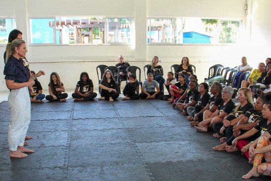 A primeira-dama Tassiana Oliveira acompanhou a aula da ex-lutadora de MMA, faixa preta 5º grau de Jiu Jitsu e especialista em segurança feminina na Vila Olímpica do Parque Guarus
