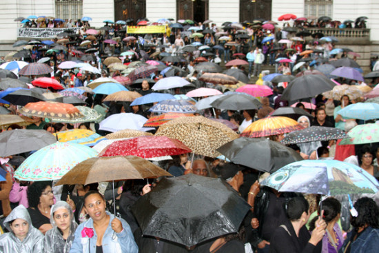 A previsão é de que, no próximo dia 26, seja apreciado pelo Congresso Nacional o veto do ex-presidente Lula à Emenda Íbsen, que prevê a redistribuição dos royalties, de forma igualitária, prejudicando os municípios produtores. Milhares de pessoas se protegem em guarda-chuvas devido ao mau tempo, mas continuam na mobilização.