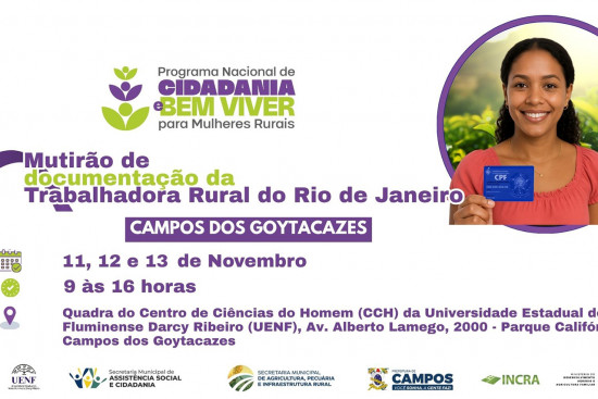 A Uenf será palco de uma grande ação em parceria com o Incra, o Ministério do Desenvolvimento Agrário e Agricultura Familiar (MDA) e a Prefeitura de Campos, por meio da Secretaria de Agricultura, Pecuária e Infraestrutura Rural, com atendimento gratuito, espaço infantil e serviços voltados à cidadania e à inclusão social das trabalhadoras rurais. Com o objetivo de promover a cidadania e fortalecer a agricultura familiar, acontece nos dias 11, 12 e 13 de novembro o Mutirão de Documentação da Trabalhadora Rural.