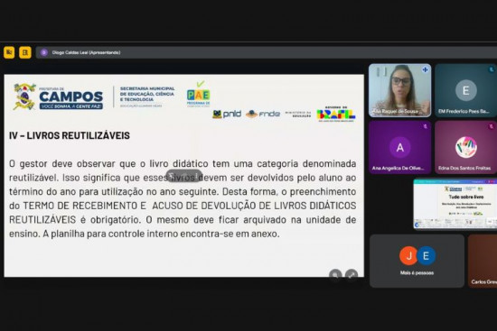 Explicar os processos ligados à distribuição, utilização e administração de livros didáticos, além de fornecer orientações práticas aos diretores, diretores adjuntos e pedagogos da rede municipal. Esse é o objetivo da formação on-line “Tudo é livro”, que a Escola de Formação de Educadores Municipais (Efem) da Secretaria Municipal de Educação, Ciência e Tecnologia (Seduct) está promoveu nessa terça (2) e quarta-feira (3). Conduzida por Ana Raquel Pourbaix, a atividade apresentou orientações sobre cronograma de entrega, critérios para escolha de obras no sistema PNLD Digital, manejo de acervos e projetos de leitura e procedimentos para devolução e descarte dos exemplares.