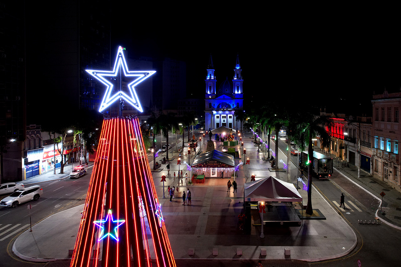 A ornamentação natalina não se concentra apenas na área central. Na entrada da cidade, na região do contorno, foi instalada outra árvore de Natal com iluminação em LED, formando um portal iluminado para quem chega a Campos durante o período de festas. Na Pelinca, a área próxima ao chafariz também recebeu decoração especial, com pontos de luz que complementam o circuito natalino e ampliam as opções de passeio em diferentes bairros. Com a Praça do Santíssimo Salvador, a região do contorno e a Pelinca integradas pela iluminação temática, moradores e visitantes podem percorrer gratuitamente os espaços decorados, registrar fotos e acompanhar a programação cultural ao longo de todo o ciclo natalino, com acesso livre às estruturas montadas durante todas as noites em que a decoração permanecer em funcionamento.