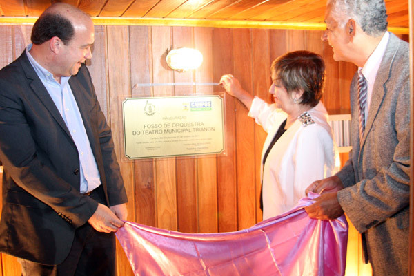 Avançando rumo ao futuro e ampliando seus recursos tecnológicos, o Teatro Municipal Trianon escreveu, na noite deste domingo (23), mais uma importante página de sua história, com a inauguração do Fosso de Orquestra. Na ocasião, o vice-Prefeito de Campos, Doutor Chicão, representou a Prefeita Rosinha Garotinho. A presidente da Fundação Trianon, Auxiliadora Freitas, e o secretário de Cultura, Orávio de Campos, acompanharam o vice-prefeito na estréia da utilização do elevador do palco e no descerramento da placa de inauguração.