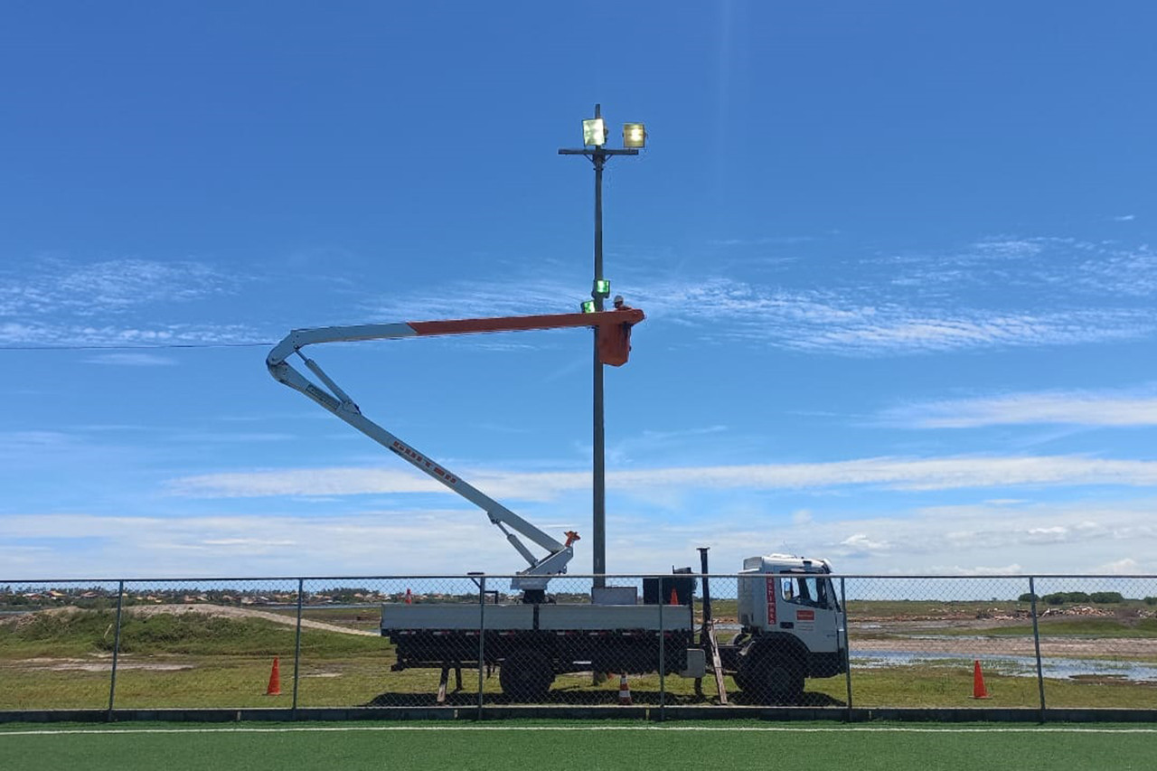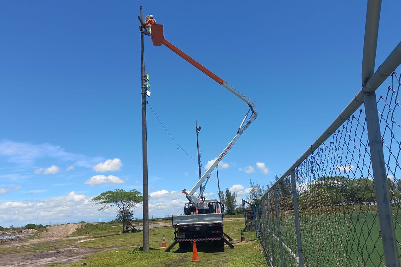 Equipes estão realizando a instalação de refletores, troca de disjuntores, substituição de lâmpadas queimadas e manutenção regular do parque de iluminação