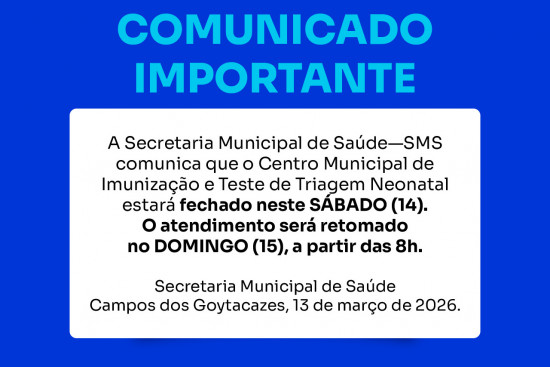 A Secretaria comunica que o Centro Municipal de Imunização e Teste de Triagem Neonatal estará fechado neste sábado