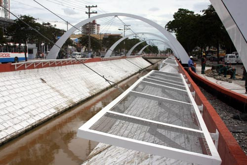 Durante a semana, operários trabalharam na instalação dos arcos sobre o valão, enquanto uma outra equipe se empenhava no término das calçadas, que receberam total acessibilidade e piso tátil para facilitar o deslocamento dos deficientes físicos e visuais.