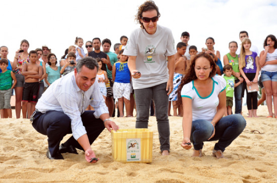 Soltura de tartarugas atrai curiosos na praia do Farol