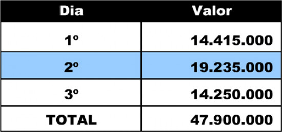 No primeiro dia, será injetado um montante de R$ 14.415.000,00. No segundo dia, R$ 19.235.000,00 e, no terceiro dia, R$ 14.250.000,00. No mês de janeiro, foram pagos, também, R$ 2.785.873,03 de abono de férias a 4,8 mil professores que usufruíram de férias coletivas.