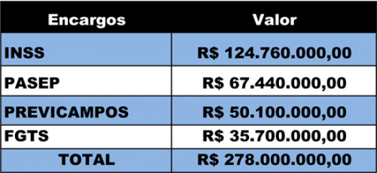 A prefeitura pagou este mês mais uma grande quantia de encargos sociais do Instituto Nacional do Seguro Social (INSS), Programa de Formação do Patrimônio do Servidor Público (Pasep), Instituto de Previdência dos Servidores do Município de Campos dos Goytacazes (Previcampos) e Fundo de Garantia do Tempo de Serviço (FGTS).