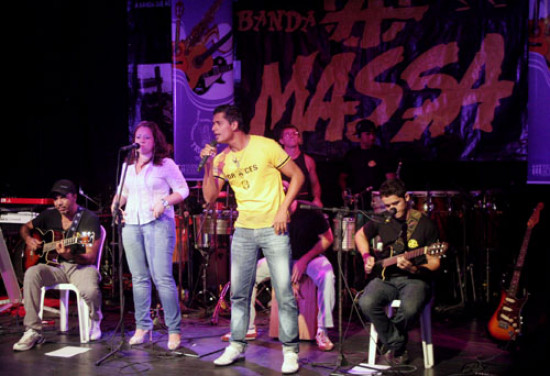 Sempre inovando, a Banda A Massa foi a atração do projeto “Fim de Tarde” desta segunda-feira (28), no Teatro de Bolso Procópio Ferreira. No repertório, canções de Lulu Santos, Kid Abelha, Capital Inicial, Paula Fernandes, Ana Carolina e Cazuza. Apesar das inovações, a batida forte da percussão, destaque do estilo da banda, se fez presente em cada canção.