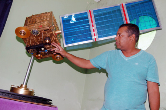 - Esta réplica foi uma encomenda feita especialmente pelo presidente da Agência Espacial Brasileira (AEB), José Raimundo Coelho, durante a Rio + 20. Ele conheceu o meu trabalho, gostou muito da plataforma submersível, mostrou uma foto do satélite e perguntou se eu o reproduziria com resíduos sólidos eletrônicos - conta o artista.