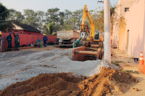 Na rua Clécio Pinheiro, após a ponte que vai para a estrada da Tocaia, está sendo implantada a galeria de águas pluviais, com a instalação d a rede de manilhas e a caixa de passagem com elevatória. As galerias tem manilhas de até 1200 metros e caixas de 2 m².
