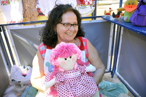Para agradar as crianças, Marli Nogueira Martins, que trabalha há 17 anos na Feira Mãos de Campos, confecciona bonecas, fantoches e acessórios de pano e o que a imaginação dos pais conseguirem alcançar para oferecer de presente aos seus filhos.